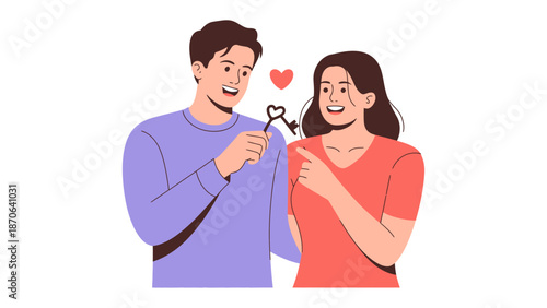 Key to the Heart: A tender moment unfolds as a man gifts a woman a heart-shaped key, symbolizing love and connection, set against an airy backdrop.