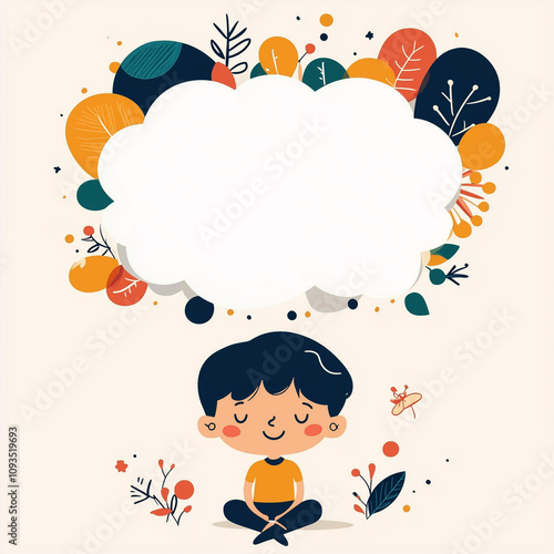 Kid flat illustration with empty text bubble above head and light bulb idea