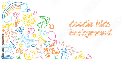 Kids doodle background. Template with children's colorful drawings. Outline drawn cartoon elements