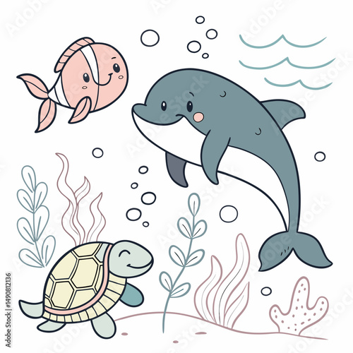 fish, sea, animal, cartoon, vector, ocean, water, dolphin, illustration, shark, underwater, octopus, tropical, marin, set, nature, starfish, aquarium, whale, baby, turtle, jellyfish, animal, life, aquatic