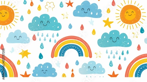 Kids' seamless sky pattern, colorful rainbows arching across, cute rain drops falling, light and airy design