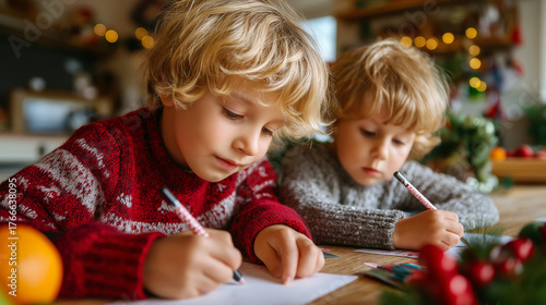 Kids writing letters to Santa at the kitchen table, crayons and stickers, hopeful faces, Christmas, letter to Santa, kids, tradition, holiday, writing, wish list, magic, with copy