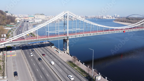 Kiev, Ukraine. River Dnipro. Pedestrian bridge. Aerial photo.