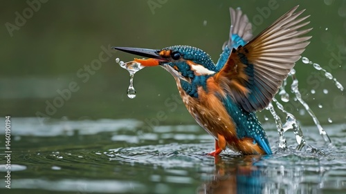 Kingfisher in mid-flight, catching a fish. A vibrant kingfisher, its wings outstretched, emerges from a splash, a small fish held in its beak. The water ripples and shimmers with droplets