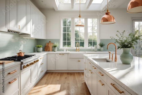 kitchen, white, counter, sink, gold, faucet, vase, home, house, modern, interior, new, floor, luxurious, design, stove, room, light, oven, decor, nobody, cabinet, refrigerator, stainless, remodel, hardwood, renovation, furniture, appliance, estate, apartment, construction, cabinetry, real, granite, pendant, steel, bright, marble, furnished, large, residential, style, island, architecture, window, clean, hood, big