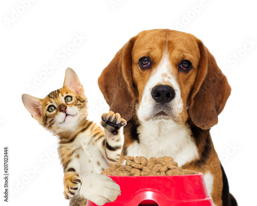 kitten, dog, beagle, white, isolated, background, brown, animal, studio, food, bowl, eating, puppy, pet, eat, ravenous, eat, canino, cute, nourishment, doggy, healthy, feeding, dinner, dish, meal, snack, lunch, funny, health, pet, purebred, young, domestic