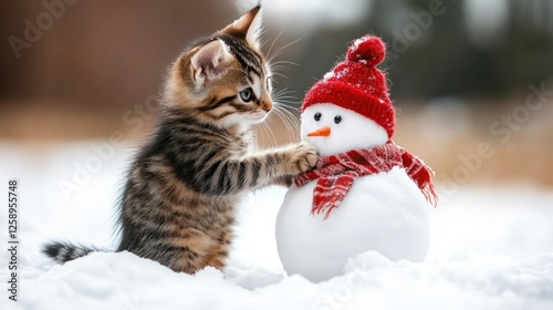 kitten, cat, cat, felino, snow, snowman, winter, christmas, cute, adorable, playful, small, tiny, red, hat, foulard, paw, fur, whisker, eye, nose, mouth, cold, glacé, fluffy, cuddly, sweet, charming, beautiful, lovely, magnificent, precious, delightful, marvellously, amazing, enchanting, captivating, irresistable, snowdrift, landscape, background, season, holiday