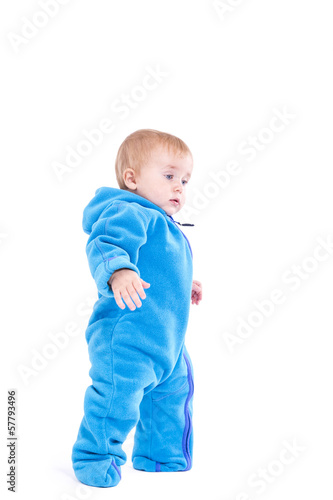 baby, arise, standing, learn, release, isolated, first steps, boy, balance, balance, funny, witty, laugh, play, smile, fun, fun, be glad, small, young, male, model, blue, baby, success, courage, force, practice, look, frightened, fear, sceptical