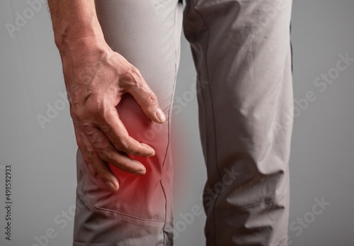 Knee pain. Man holding painful leg with red spot closeup. Arthritis, tendonitis, injuries consequences. Overuse. Traumas caused by sport. Health care, orthopedic problems and medicine concept. photo