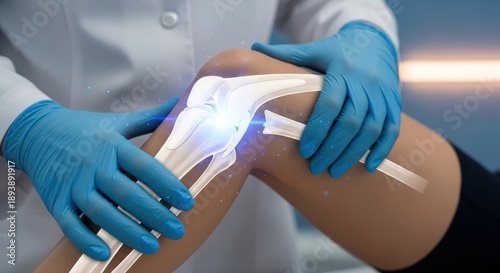 Knee pain surgery options concept. Medical professional examining a knee joint with a digital focus on the area.