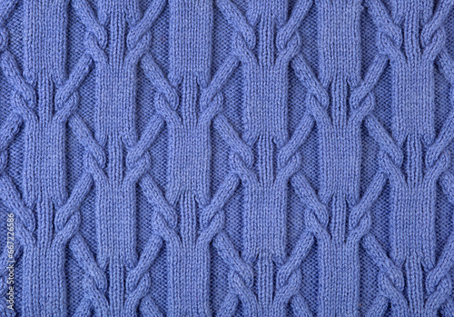 Knitted blue abstract background. Large knitted fabric with a pattern. Close-up of a knitted blanket. Copy space