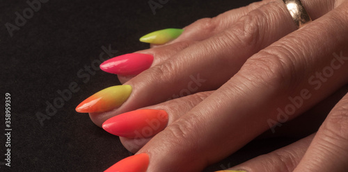 Kolorowe paznokcie przedstawione z bardzo bliska, na ciemnym tle