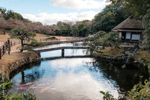 grass, scenery, culture, popular, history, heritage, tree, season, attraction, tea house, garden, beautiful, landmark, peaceful, winter, japanese, architecture, park, landscape, okayama, water, asia, japan, nature, lake, travel, region, design, outside, outdoors, landscaping, destination, asian, duck pond, river, wooden, traditional, environment, stone, three, great