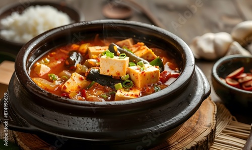 Korean Doenjang Jjigae with Tofu and Vegetables Cooked in a Clay Pot Generative AI