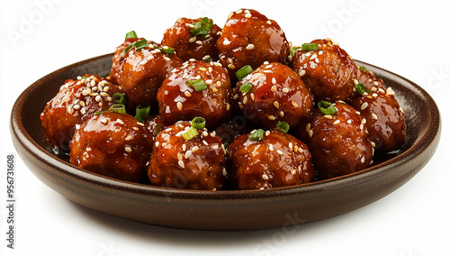 Korean meatballs with sauce on a brown plate, isolated against a white background