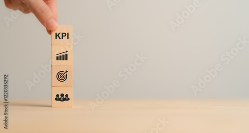 KPI concept. Wooden blocks with KPI icons,copy space. Key Performance Indicator using business intelligence metrics connected to database. Business, finance, operations, sales, marketing performance