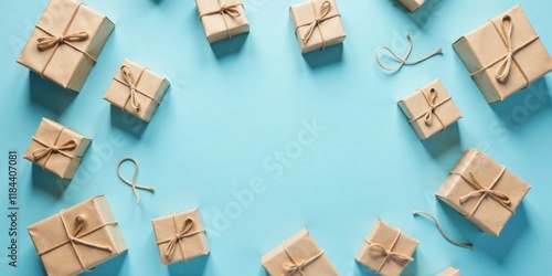 present, gift, package, box, paper, brown, twine, string, bow, ribbon, background, blue, pastel, overhead, topview, simple, minimalist, celebration, birthday, anniversary, holiday, festive, small