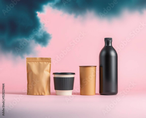 Kraft Paper Packaging and Black Bottles on Pink Background