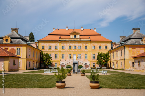 Krasny Dvur Chateau, North Bohemia, Czech Republic, 19 June 2021: Baroque yellow castle with stairs, front yard with green lawn and white benches at sunny summer day