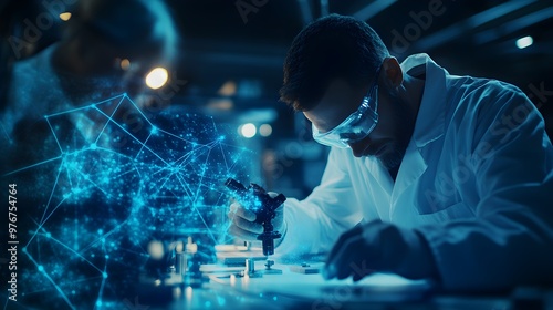 laboratory, technician, white, coat, inspect, beryllium, copper, part, microscope, holographic, overlay, observe, material, perception, process, protocol, futuristic, examine, equipment, polish, report, accuracy, record, measurement, component, technology, advance, alloy, enhance, thermal, visual, study, safety, metal, procedure, surface, optical, quality, cleanliness, property