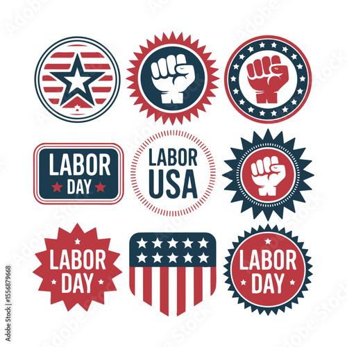 labor, day, us, american, flag, star, stripes, fist, power, oneness, men at work, celebration, badge, seal, icon, symbol, graphic, design, illustration, patriotic, red, white, blue, vintage, retro, holiday, set, collection