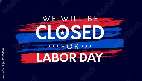 Labor Day Closure Notice: A bold and patriotic announcement, using stylized brushstrokes, communicates CLOSED for Labor Day against a striking, dark background.