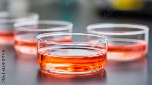 Laboratory petri dishes containing orange liquid samples under sterile lighting conditions visualizing biological testing diagnostics and health fluid analysis in a scientific environment