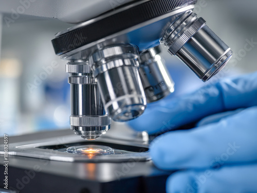 Laboratory researcher adjusting a professional microscope lens while wearing blue gloves for precise scientific sample observation and analysis