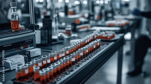 Laboratory scene with rows of test tubes containing red liquid organized on a workbench, surrounded by scientific equipment and blurred background.