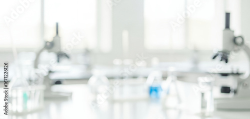 Laboratory setting with microscopes test tubes and other scientific equipment blurred, showcasing advanced research environment with clean bright workspace and modern tools.
