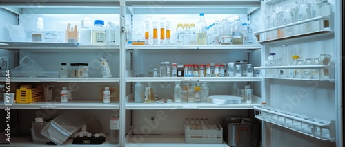 laboratory, shelf, chemical, equipment, organised, scientific, pristine, research, storage, glass bottle, clinical, science, medical supplies, precision, cleanliness, sterile, medicine cabinet, experimentation, detailed, cold storage