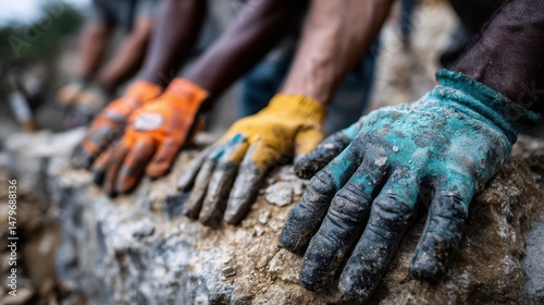 labourer, glove, tool, construction, teamwork, hand, effort, industry, site, men at work, safety, collaboration, building, dirt, rugged, equipment, orange, green, blue, mechanic, craftsmanship, activity, labor, action, stone, material, rough, strength, group