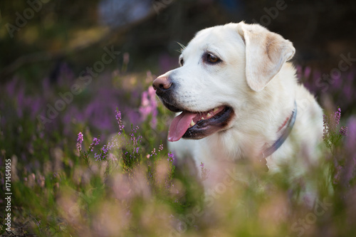 Labrador retriever in heather flowers