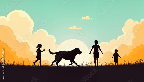 labrador, children, silhouette, running, sunset, joy, play, companionship, nature, happiness, grass, cloud, colourful, family, youth, energetic, freedom, affection, bonding, friendship, two-tone, abstract, exercise, leisure, movement, playful, two adults, vibrant, warm colors, evening, joyful, summer, wholesome, innocence, laughter, exploration, scenery, sunlight, emotion, connection, outdoors, harmonious