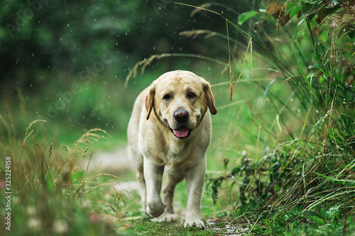 Labrador Retriever walking along path in nature