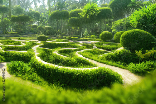 labyrinth in a beautiful lush nature environment, zen garden in the park, digital illustration, digital painting, cg artwork, realistic illustration, book illustration
