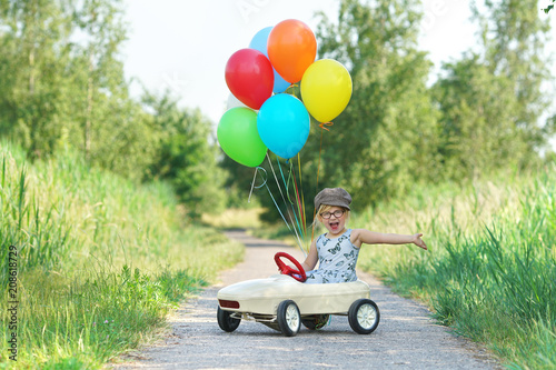 lachendes Mädchen im Tretauto mit bunten Ballons