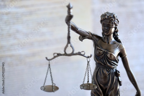 Lady Justice old statue and US Constitution blurred page close up. Lawsuit and justice in US