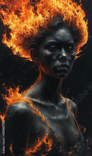 black, beautiful, passion, desire, burning, hair, raging, closed, eye, mouth, fashion, model, art, elegance, skin, burn, hot, red, smoke, danger, blaze, orange, light, fantasy, inferno, fairy, body, devil