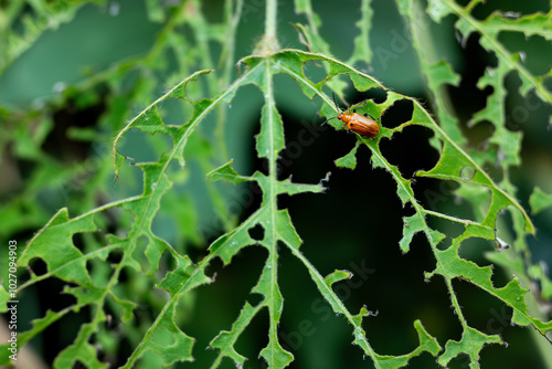 leaf, plant, surface, tissue, eaten, hole, damage, feeding, eating, biting, beetle, insect, bug, animal, small, herbivorous, diet, nature, outdoors, field, asia, japan