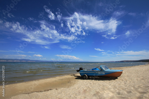 Lake Baikal, Olkhon island, a nature reserve, with its sandy Bay, summer, boat