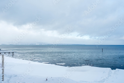 lake tahoe, lake, tahoe, winter, snow, cold, freeze, water, tree, mountain, sky clouds