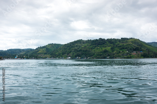 lake, natural, caldera, indonesian, island, sumatra, indonesia, volcano, asia, asian, nature, water, landscape, scene, scenery, coast, shore, hill, mountain, rain, rainy, season, dull, cloud, cloudy, storm, panorama, panoramic, view