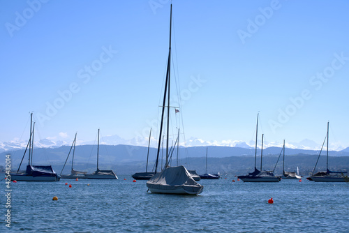 Lake Zurich at springtime with sailing boats with blue sky and snow capped mountains in the background. Photo taken April 4th, 2021, Zurich, Switzerland.