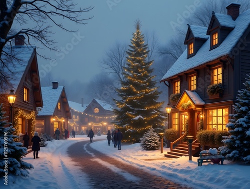 landscape, christmas, city, village, light, bokeh, cosy, celebration, tied-up, shopping, snowing, winter, holiday, festive, season, decoration, bright, wonderland, urban, bustling, night, merry, cold, joyful, atmosphere, bustling
