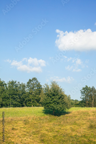 tree, sky, landscape, field, grass, nature, green, meadow, summer, blue, spring, cloud, cloud, horizon, rural, countryside, tree, land, country, environment, outdoors, beautiful, hill, lonely, agriculture