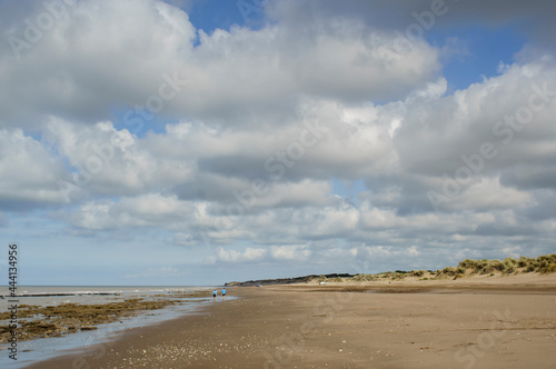 Landscape of a beach with some people walking and wide blue sky with white cotton clouds