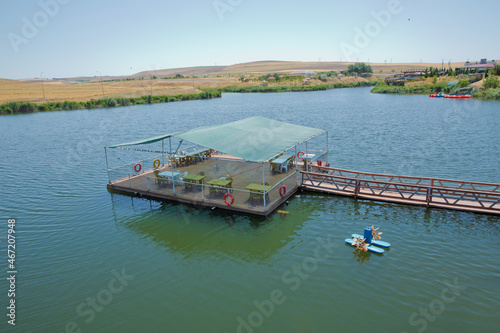 Landscape of an mountain lake in front of mountain range. Glorious lake landscape. The collaboration of blue and green. Restaurant and bridge in the middle of the lake . View of Abant Lake Golu .