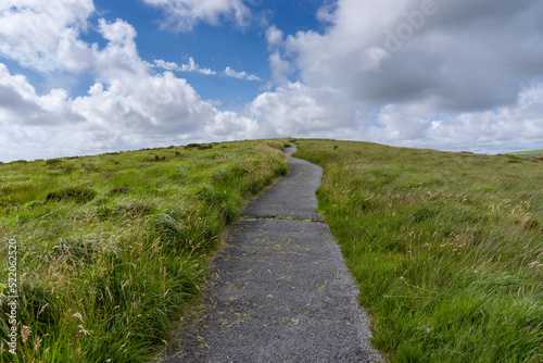 landscape of hiking trail leading through the meadows and hills of the Ballycroy National Park in County Mayo