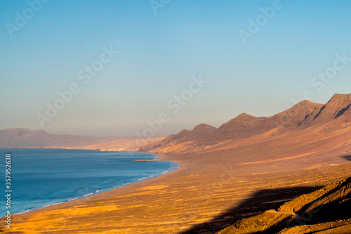 Landscape of Panoramic vulcanic mountains and Atlantic Ocean , dunes of coralejo and Gran Tarajal Port in Fuerteventura, Lanzarote